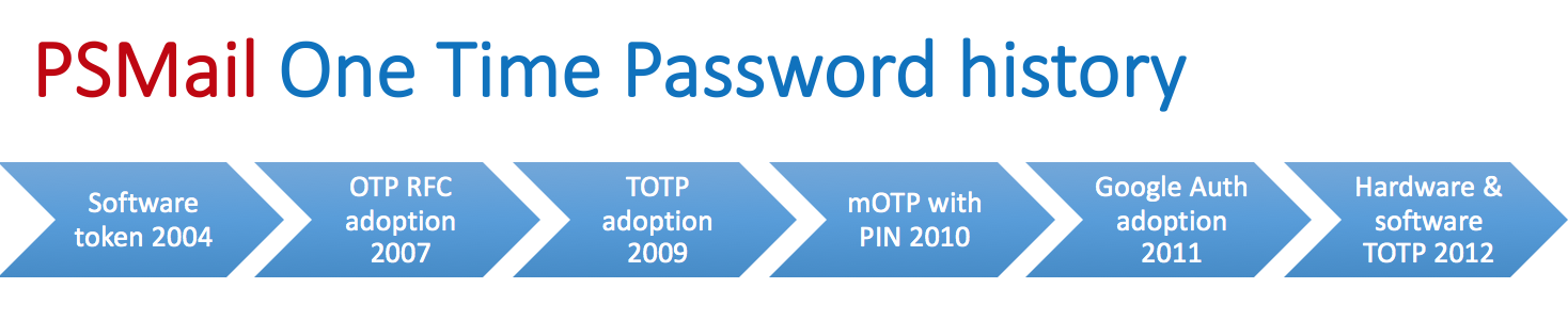 PSMail has thought about this problem long since 2004! We have been providing software based token to time based OTP token support for sometime. The image below displays our evolution through history.