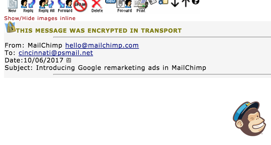 When you receive emails from friends or coworkers who are already in your contact list (i.e. address book), PSMail ensures that these emails are automatically whitelisted and arrive in your Inbox in a timely fashion. The emails that you receive from people in your contacts also display embedded images automatically; there is no need to click “Show/Hide inline images” for these emails (see example below: as hello@mailchimp.com is trusted and in the user’s address book the image gets automatically rendered).