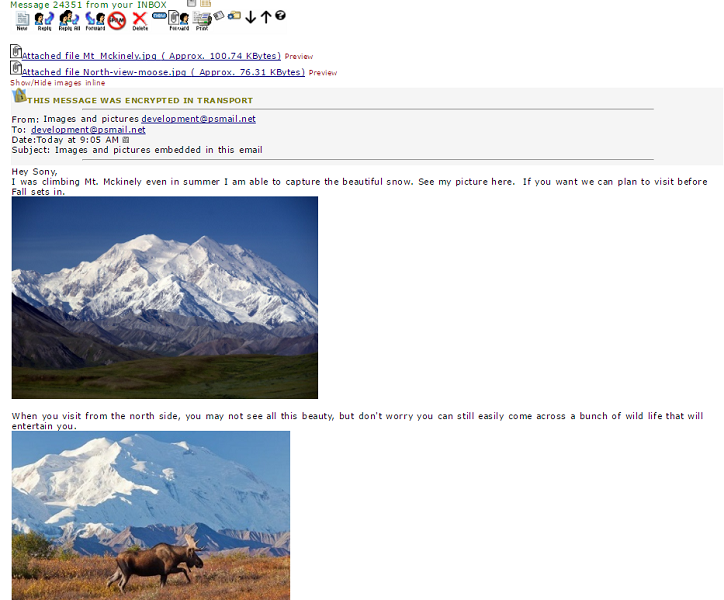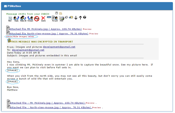 The above screenshot shows an email with embedded images. When the user clicks on the “Show/Hide images inline” you can see the images expand inline as shown below: